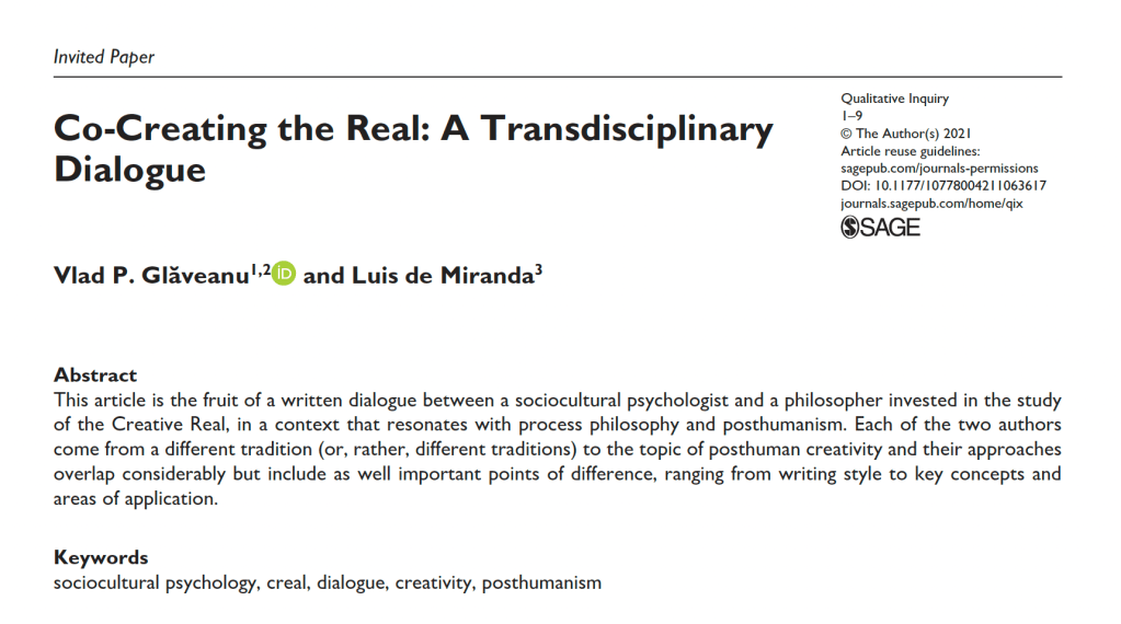 Glăveanu VP, de Miranda L. Co-Creating the Real: A Transdisciplinary Dialogue. Qualitative Inquiry. December 2021. doi:10.1177/10778004211063617